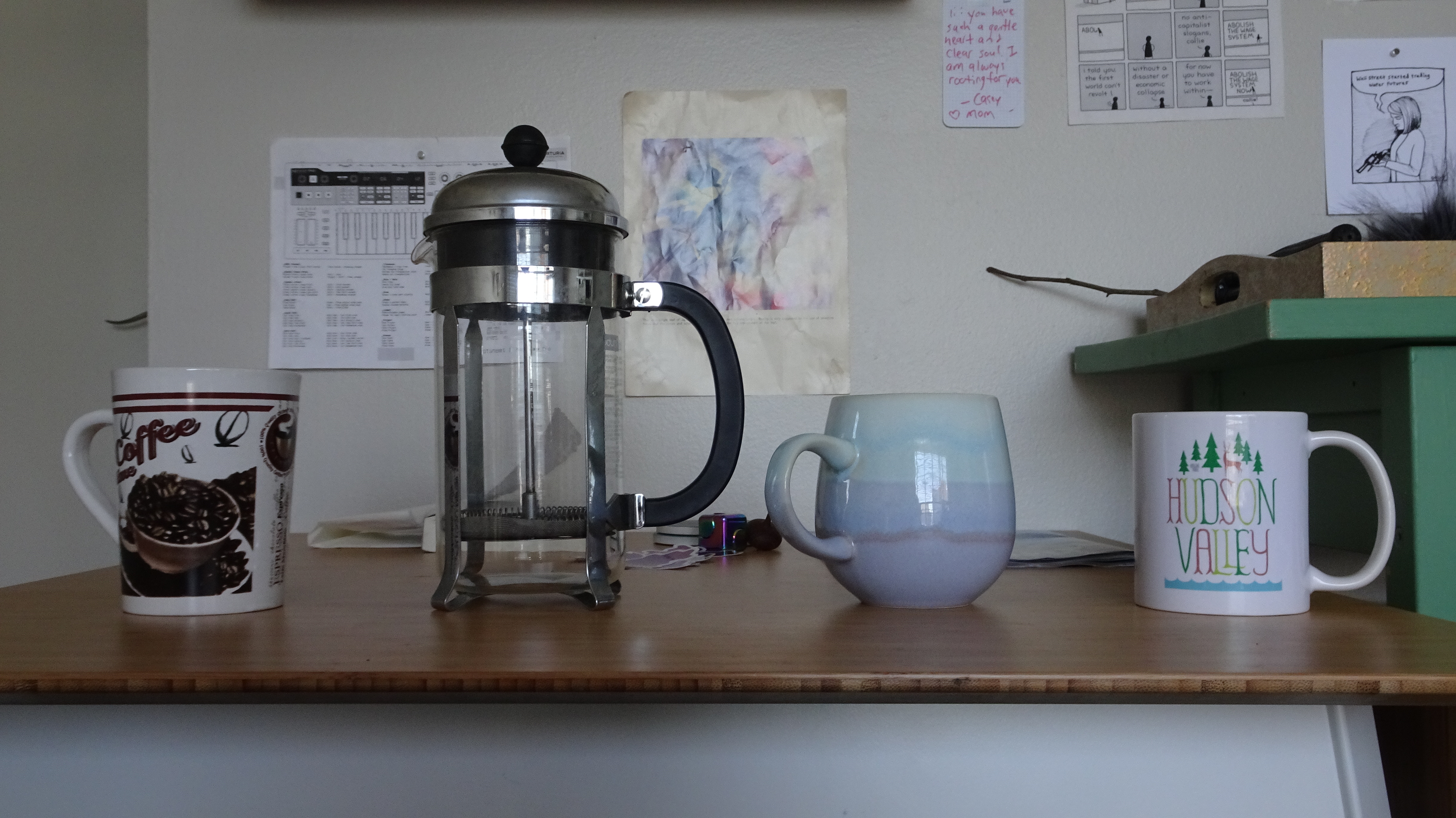 these are my cups (they're kind of mugs (a french press is kind of like a mug)). the thing is i don't own any glasses yet??? (except the glasses i'm wearing (not cups))